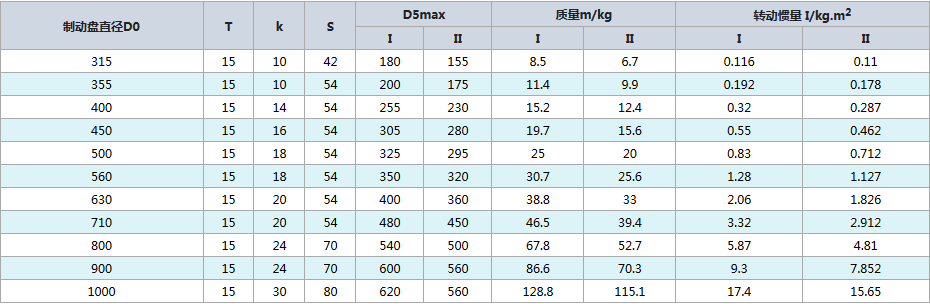 制動盤的主要尺寸、質(zhì)量和轉(zhuǎn)動慣量/mm